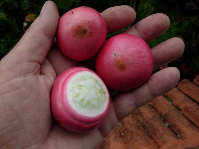 1. Small fruit, only 1-1.5" across, with pink to purple skin that is said to have an excellent delicate, avocado-like flavor. 1